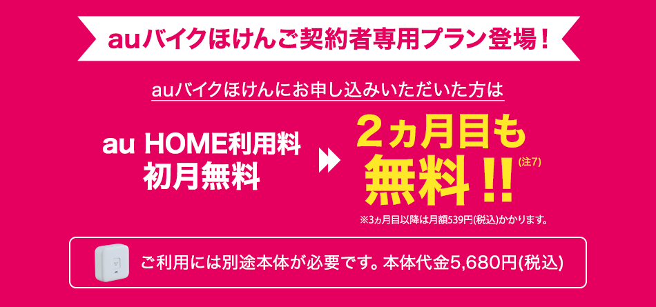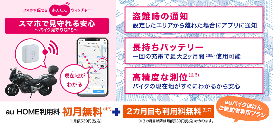 - 注2)新規または継続の申し込み手続きを完了した「auバイクほけん(総合バイク保険)」について、ご契約時の年間保険料(保険料を分割で払込むご契約の場合、一年間分の保険料)の2%分のPontaポイントを還元する制度です。