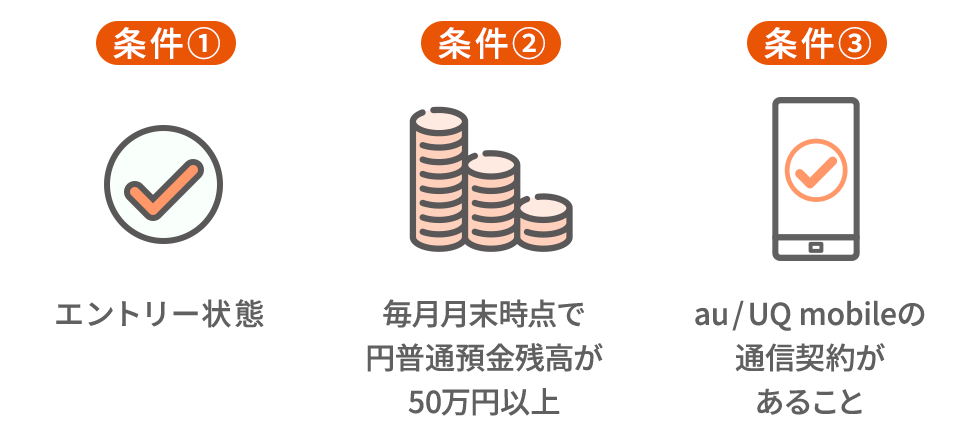 ③残高判定日において、auじぶん銀行に登録されているau IDに紐づくau/UQ mobileの通信契約があること