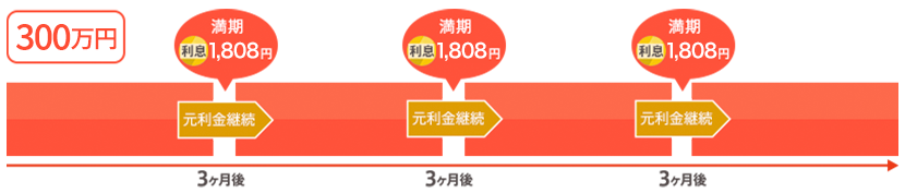 ※3ヶ月後にお受取りいただける利息の計算式[300万円×0.3%×(92日÷365日)=2,268円(税引前)、2,268円-税金460円=1,808円(税引後)]