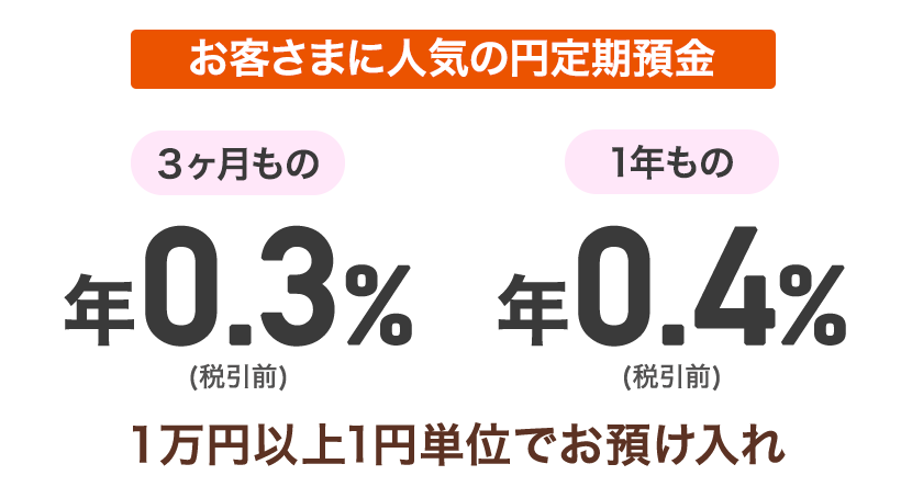 円定期預金は解約による手数料はかかりません(利息には中途解約金利が適用されます)。いざお金が必要になっても、解約による元本割れの心配はありませんので、お手元の資金の多くを一括でお預入れいただくのもよいかもしれません。